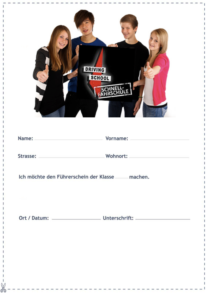 Hier hast Du die Möglichkeit an einer Schnupper- Theoriestunde teilzunehmen. Um an der Theoriestunde teilzunehmen, musst Du den Gutschein ausdrucken und ausgefüllt in unsere Fahrschule bringen.